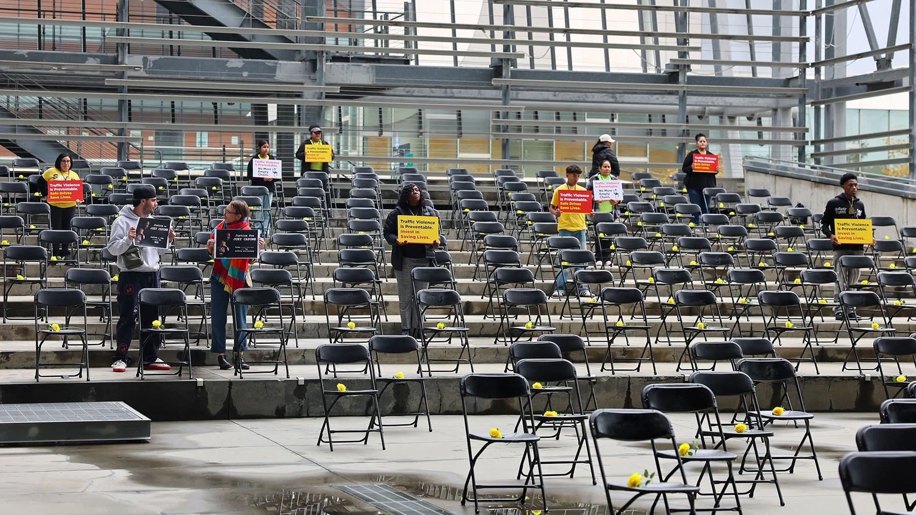 This year, SAFE led a coalition of partner nonprofit organizations and local and state agencies to gather and place 711 black chairs, each adorned with a single yellow rose, throughout the Caltrans and LAPD plazas to represent every life lost to traffic violence in Los Angeles County in 2024. Along with the art installation of empty chairs, we held a press conference and hosted a safety village for the community to engage with road safety advocates.