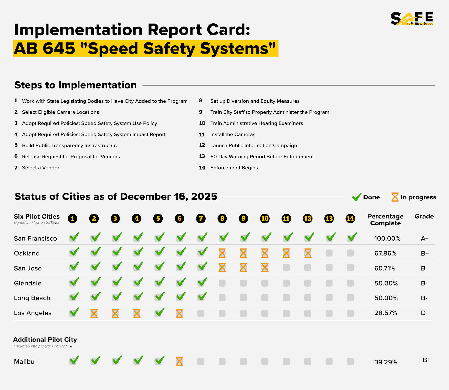 While San Francisco already has their speed cameras ticketing speeding drivers and making roads safer, implementation in all three Southern California cities has been slow, leaving vulnerable road users at continued risk of injury or death.