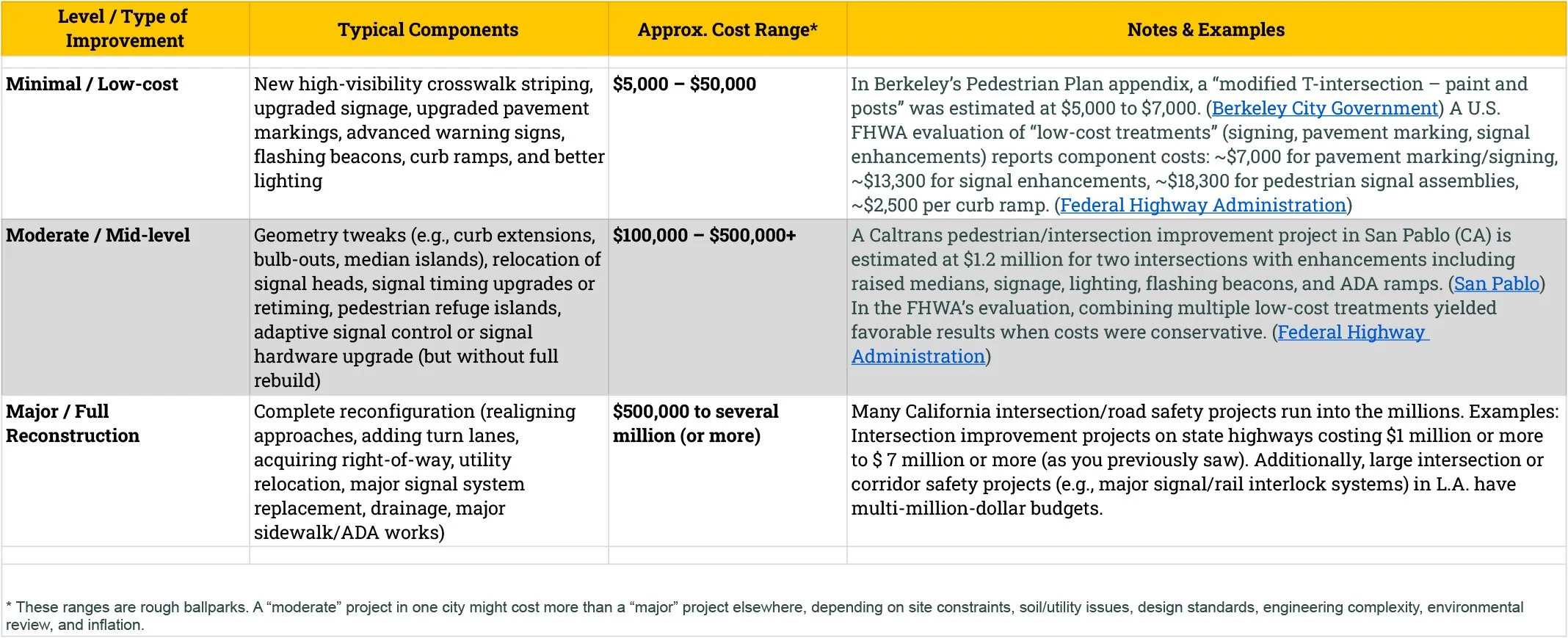 For example, in the City of Los Angeles alone, an LA DOT report identified 90 intersections as being the most dangerous. The cost to improve the safety of these intersections can vary widely, ranging from $5,000 to more than $5,000,000. Below is a model “cost by level of intervention” table based on California / U.S. references, showing rough cost ranges for different scales of intersection safety upgrades. These are illustrative—not guarantees—and actual costs depend heavily on site conditions, right‐of‐way, utilities, and design complexity.