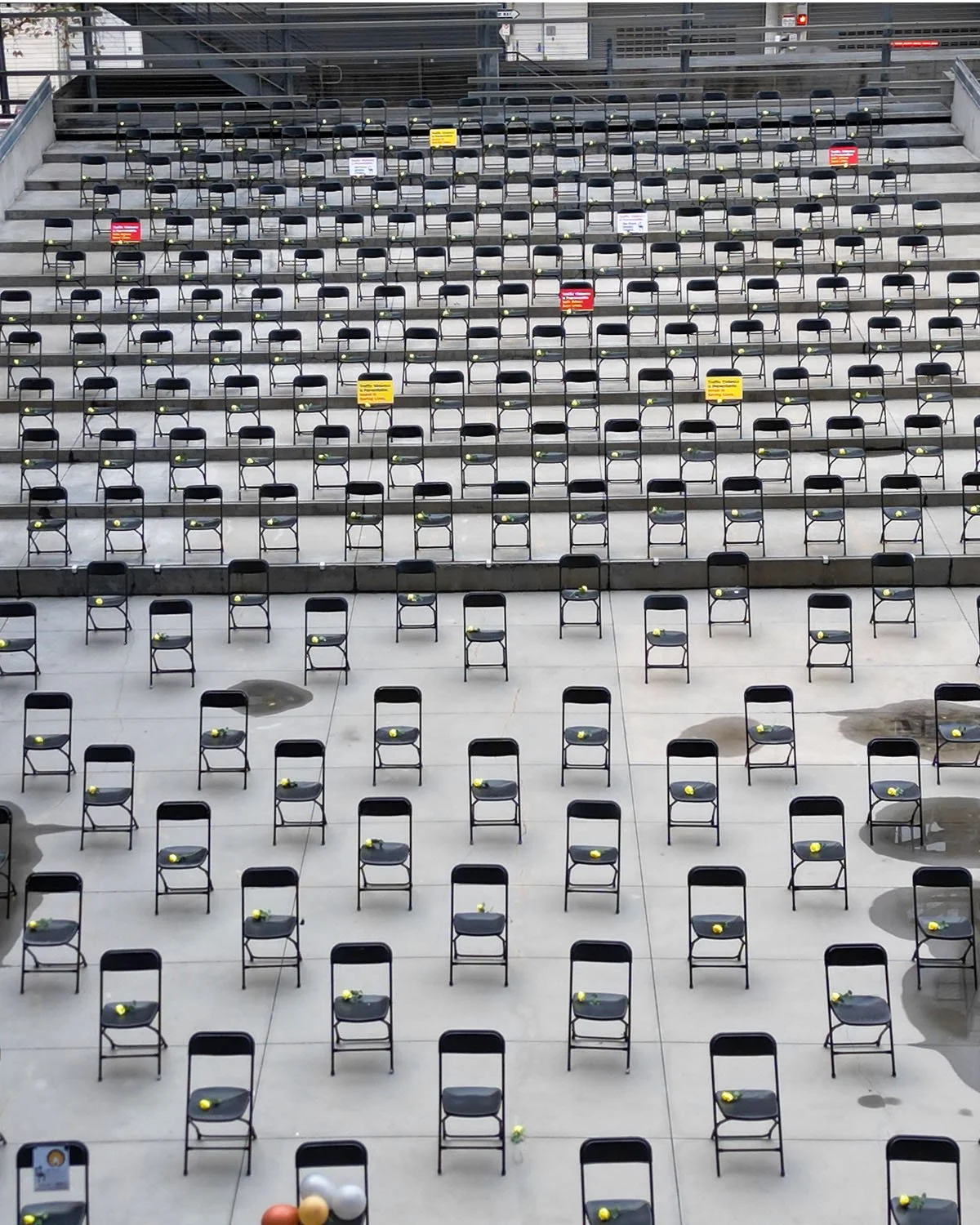 The event was held in the Caltrans District 7 Building Plaza in Downtown Los Angeles and included an art installation of 711 empty chairs, a press conference, and a safety village where local organizations provided resources to the community.